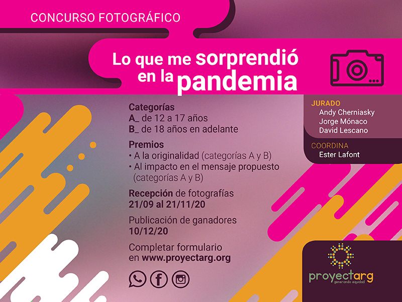 Proyectarg te invita a participar de un concurso fotográfico donde se buscan recoger imágenes que representen todo aquello que te sorprendió en esta pandemia. Seguramente tus hábitos, compañías, trabajo, barrio y derechos se han modificado en esta etapa y por eso convocamos a niñes, adolescentes y adultos de 12 años en adelante, residentes en Argentina y no profesionales, a enviarnos su fotografía sacada desde su celular o cámara fotográfica.